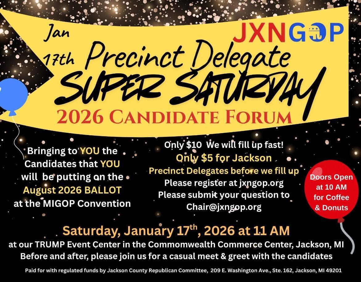 Are you a Republican Party precinct delegate in Jackson, Michigan? You don't want to miss this opportunity to be a part of the Precinct Delegates Super Saturday Forum, where attendees will have the chance to hear directly from individuals seeking the Attorney General and Secretary of State nominations for the midterm ballot. The forum provides delegates with information, context, and insight that can help them make informed decisions during the county convention and subsequent stages of the nomination process. Not a Jackson County Precinct Delegate? No Problem you are also invited. This event is on January 17th at 11 A.M. In the JXNGOP Headquarters located on the 3rd floor of the Commonwealth Commerce Center STE. 320. Doors will open at 10 A.M. for coffee and doughnuts. Jackson County Delegates $5, General Admission $10