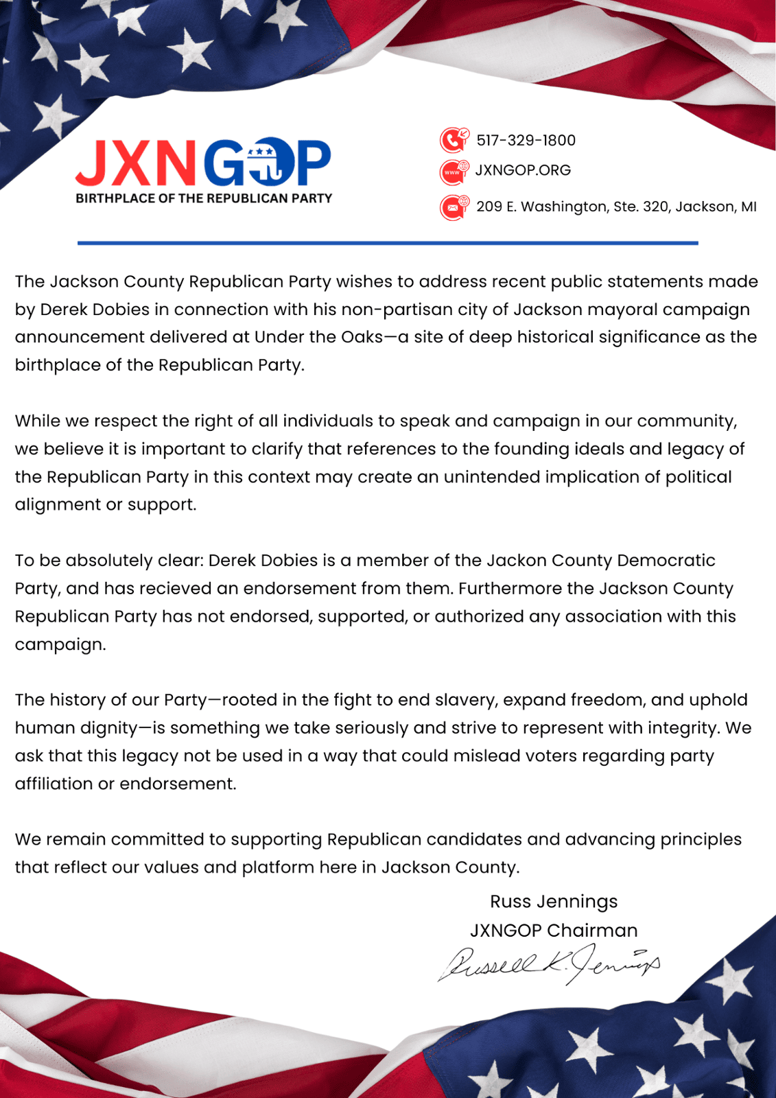To be absolutely clear: Derek Dobies is a member of the Jackson County Democratic Party and has received their endorsement. The Jackson County Republican Party has not endorsed, supported, or authorized any association with this campaign.